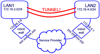 I'm now setting up OpenVPN, which according to the some documentation is somewhere in m0n0wall as well, although I can't find it in 1.231 or 1.23. So I'm just setting up to run on one machine each side in bridged mode and then I'll set a route in m0n0wall each side to that machine (since my default routes are the LAN ports on m0n0wall as shown in the diagram)