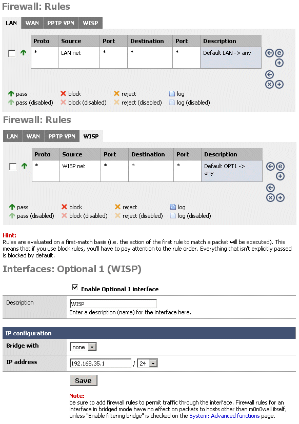 The only variable is m0n0wall since the other router you put in between works without any issues. First, I've attached a screenshot of mine, so minus the part that the IP range is different, basically your config is very similar to this right in that OPT1 is not bridged, and the LAN and OPT1 firewall rules are the "allow all" type?