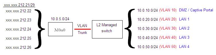 I've got a /29 block of public IP's that I would like to route via NAT to separate, private VLAN networks. I have this currently running on an old Cisco 2611 router, but I'd like to replace it with a M0n0 setup to add VPN. captive portal, and rate shaping functionality to the overall configuration. I dont have any servers per-se on the LAN networks (yet); I just need each private LAN network to act/function as if it's got it's own separate NAT route to a specific public IP.