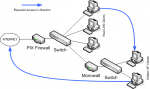 The M0n0 VM has two (virtual) NICs, one of which points to the external facing (physical) NIC of the host; the other to an virtual switch that is internal to the host. The clients have one NIC each, which point to the same virtual switch. The M0n0 is the default gateway for the XP clients and, currently, the XP clients can see the internet via the M0n0.