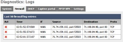 I put up jpg images of the rules config page, firewall rules page and the firewall log on my website at: