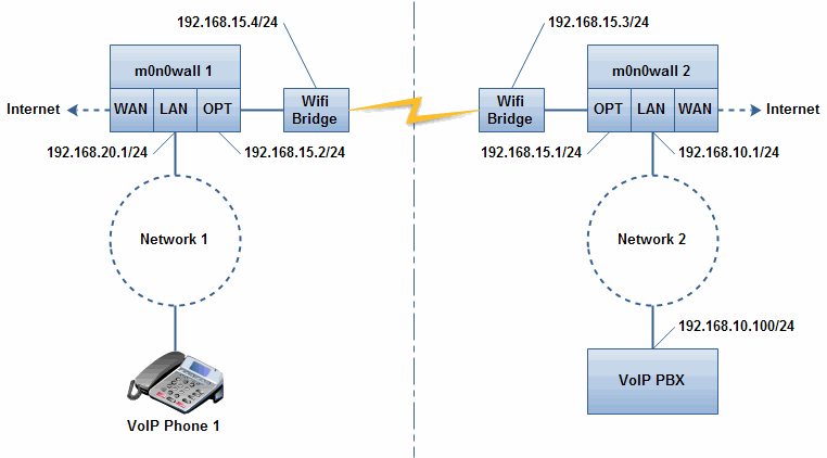 * 192.168.20.0/24 * * * In network 2 there is a VoIP PBX with a few SIP phones. All these work fine (internal and external communication through the internet gateway on m0n0wall 2).