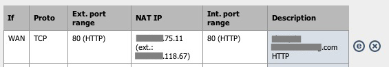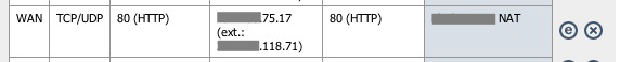 For the first web server, all 80 traffic is pointing from the external IP xxx.xxx.118.66 (main WAN configuration) to internal xxx.xxx.75.2 with just NAT and firewall rules for port 80.