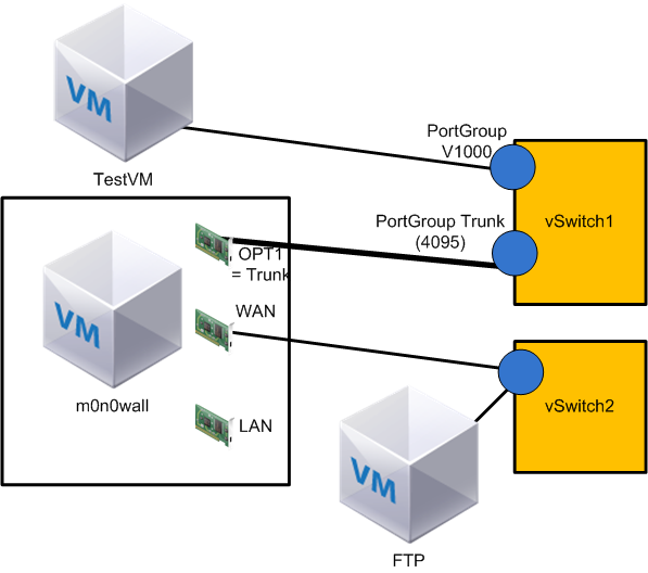 I am trying to use monowall within a virtual Environment (vSphere 4) to give several VMs, which are grouped in different VLANs, access to one PC going to be FTP in furture.